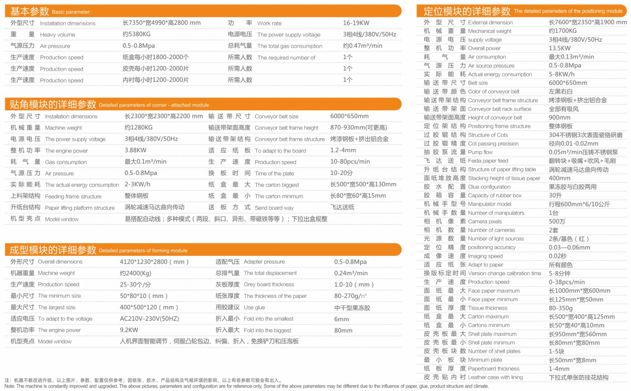 The machine is mainly divided into three parts: positioning module, angle sticking module and forming module. It can realize automatic paper feeding, automatic glue passing, automatic angle sticking, automatic positioning, automatic forming and automatic bubble pressing in the production of all kinds of cartons, wooden boxes and plastic boxes. It can complete a series of technological processes automatically, transfer plates quickly, and produce exquisite boxes. The positioning module includes black-and-white belt, double lens, automatic deviation correction, skin plate lining positioning and five plate positioning. Non adhesive tape slot and double lift paper table of corner module. The intelligent adjustment, automatic locking, servo cam action, no change blade and pressure foam board of the molding module are designed and produced by our company, and have obtained a number of national patents.